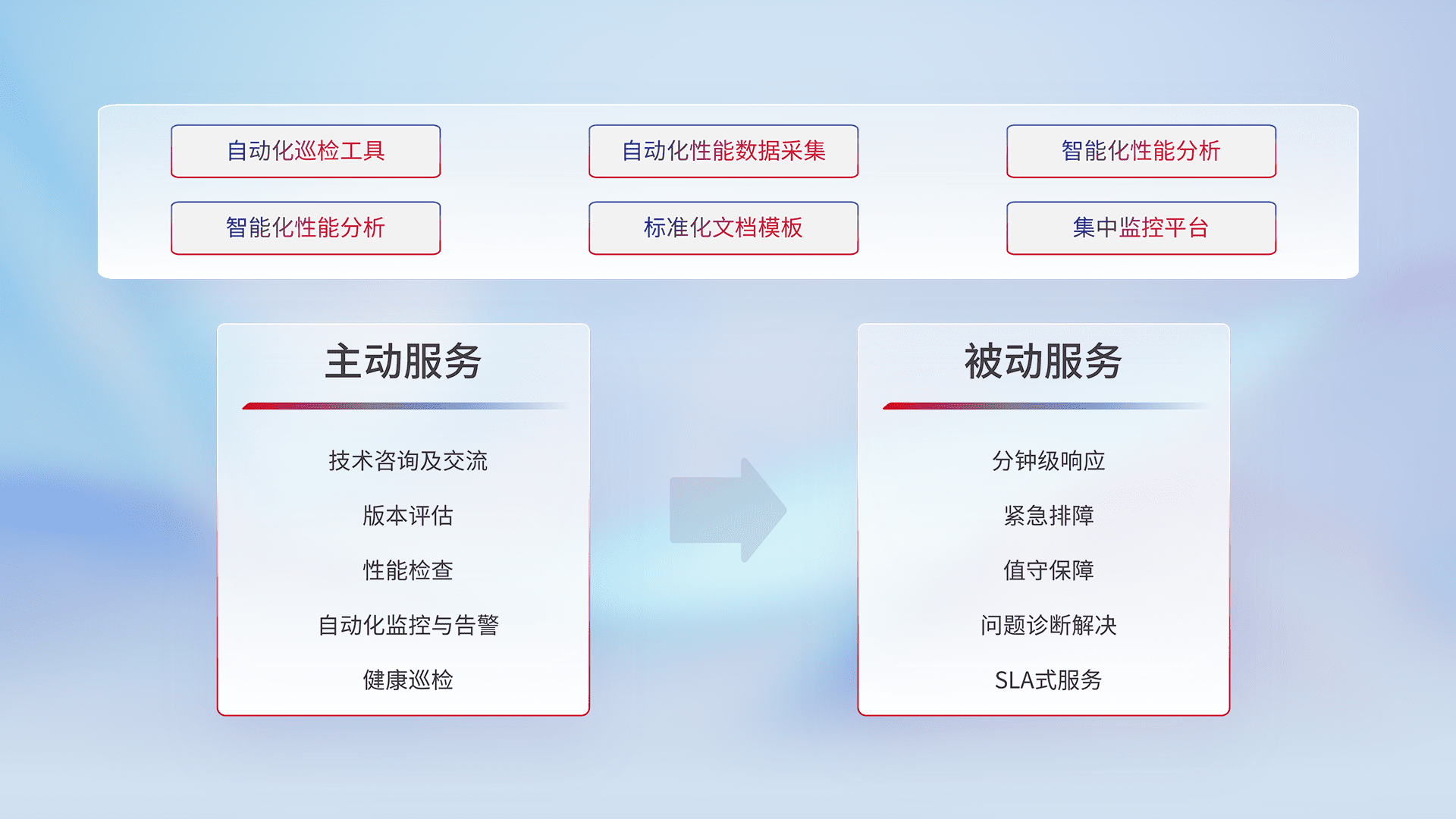 智能化工具和标准化文档,,保障服务质量,,提供主动服务(包含技术咨询、、、、版本评估、、、性能检查、、、自动化监控与告警、、健康巡检)和被动服务包含(分钟级响应、、紧急排障、、、值守保障、、、问题诊断解决、、、、SLA服务)。。。。