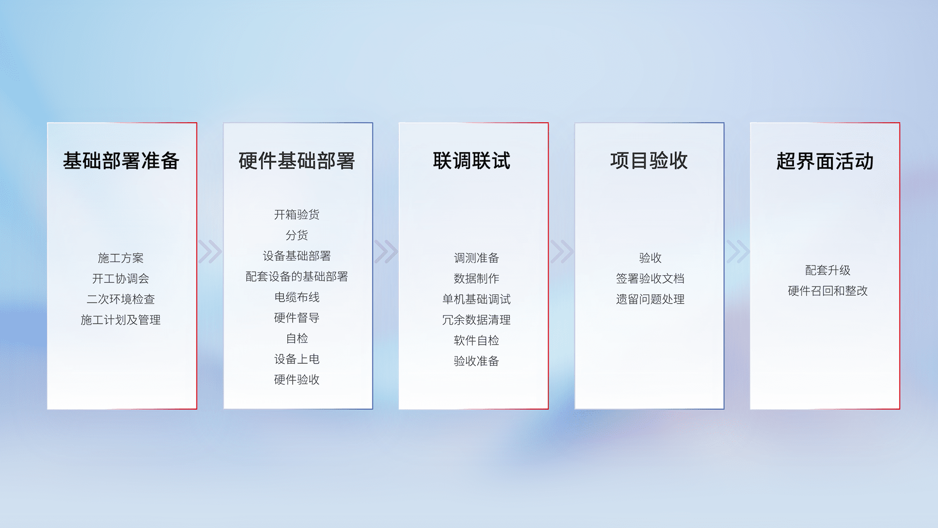 从基础部署准备、、、硬件基础部署、、、联调联试、、、项目验收、、越界面活动的全过程可追溯,,,,保证施工质量和进度。。。。